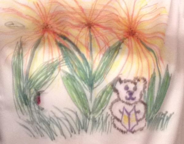 Hmmm... Jim, why'd you have to give me ideas? So I ran off to Target and picked up a cheap C9 wicking shirt and, in sharpie, drew a picture of a bear reading a book under some flowering plants and on the back I wrote: